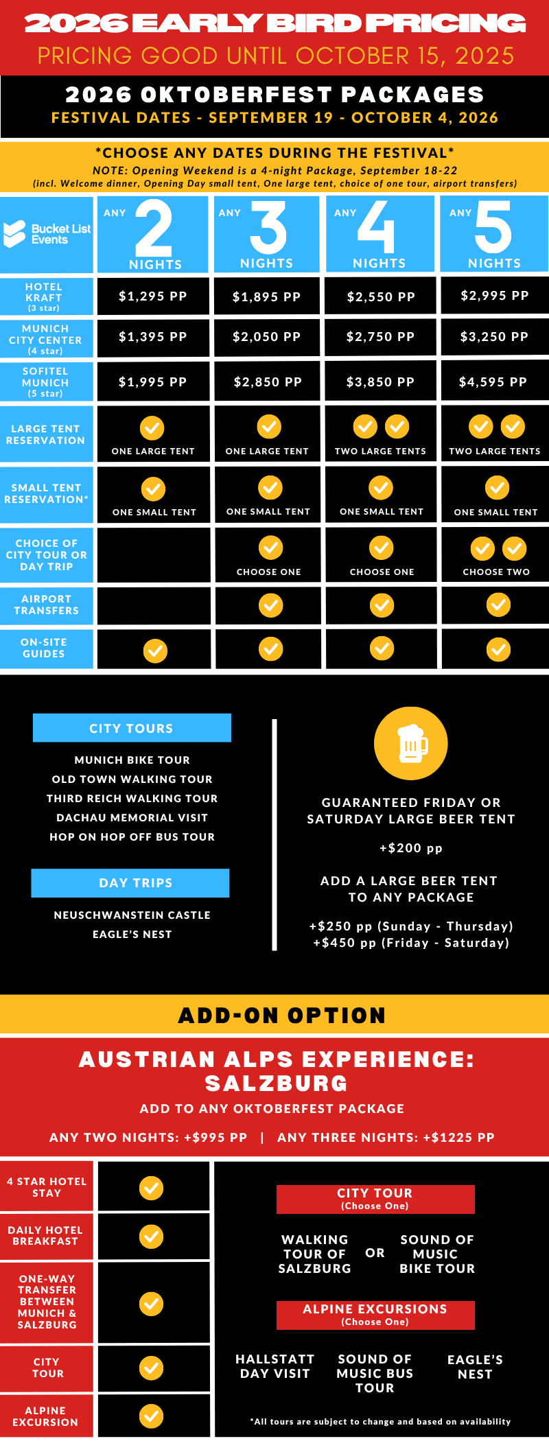 Our Oktoberfest packages are customized to fit your needs, schedule, and budget. Here is a general overview of our standard packages and pricing (all pricing is per person, and based on double occupancy). We also feature an add-on experience for Oktoberfest clients to visit the nearby city of Salzburg and the Austrian Alps. Learn more about our packages and secure your spot HERE