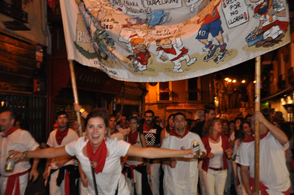 When you are walking down the street in Pamplona during the San Fermin and suddenly find yourself surrounded by a tumultuous group of people dancing and singing in a chaotic way, cheer yourself up! You have encountered the famous Peñas of Pamplona. These groups of local citizens patrol the streets of the Old Part of the town, singing, dancing, laughing, playing traditional songs, and maintaining the spirit of the fiestas. The Peña’s are similar to a fraternity/sorority or a social club, and their 200-400 active adult members pay an initiation fee and monthly dues.